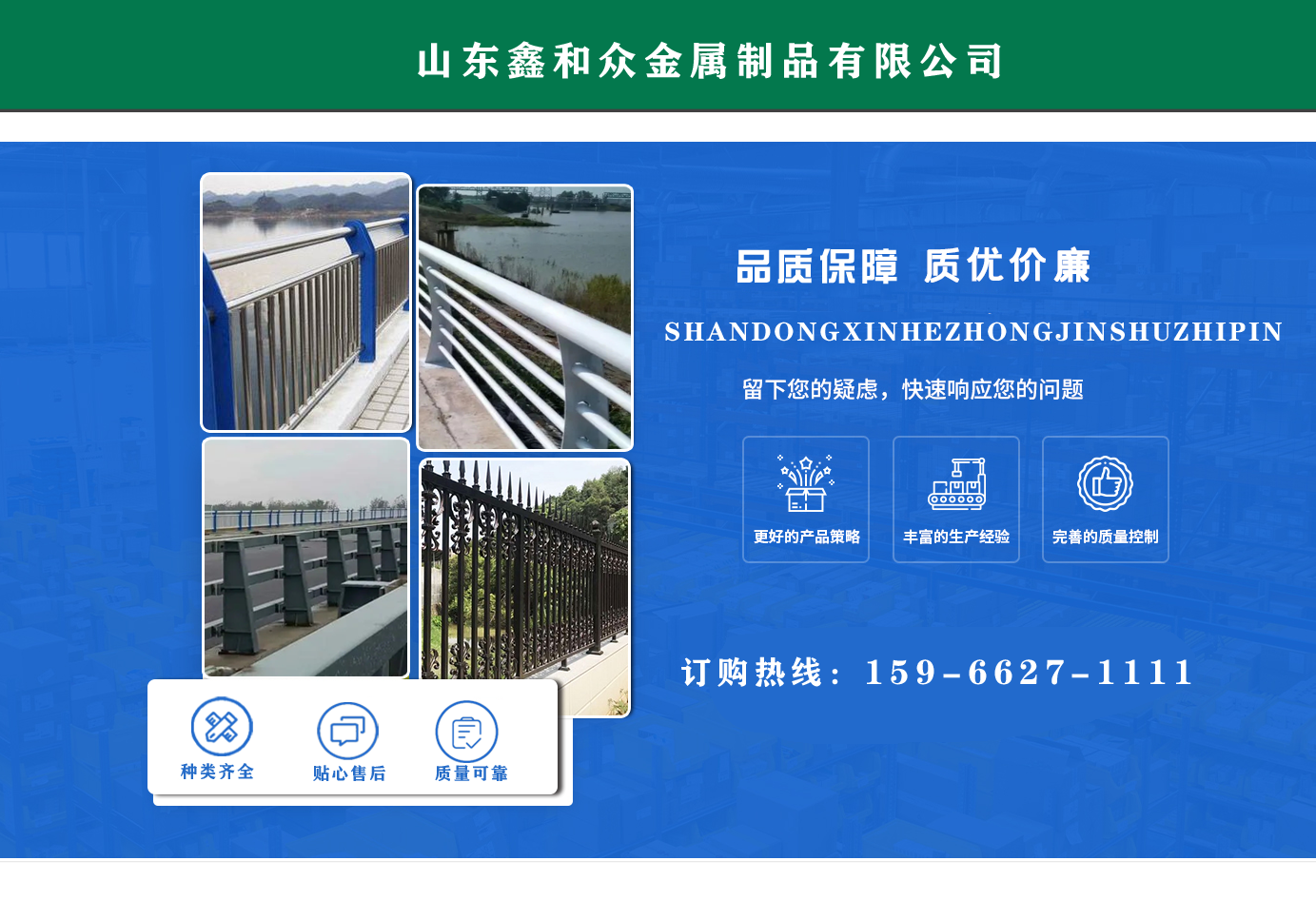 山東鑫和眾金屬制品有限公司主要產(chǎn)品有防撞護(hù)欄,橋梁護(hù)欄,道路護(hù)欄,河道護(hù)欄,不銹鋼護(hù)欄等護(hù)欄。提供設(shè)計(jì)方案,一站式定制,包您滿意價(jià)格優(yōu)惠,歡迎來電咨詢! 公司常年從事銷售護(hù)欄防撞護(hù)欄,橋梁護(hù)欄,道路護(hù)欄,河道護(hù)欄,不銹鋼護(hù)欄,橋梁鋼護(hù)欄,河道燈光護(hù)欄等。產(chǎn)品廣泛應(yīng)用于橋梁、河道、旅游景區(qū)、道路、公路、公園、小區(qū)、景觀、道路防撞等領(lǐng)域?! 」井a(chǎn)品均采用優(yōu)質(zhì)不銹鋼材料,符合相關(guān)標(biāo)準(zhǔn)。各種型號(hào)不銹鋼復(fù)合管及護(hù)欄,質(zhì)量嚴(yán)格把控。產(chǎn)品強(qiáng)度高、耐腐蝕、焊接牢固、抗沖擊、性能好,防撞護(hù)欄結(jié)構(gòu)簡單、美觀實(shí)用大方。 歡迎前來訂購!...
